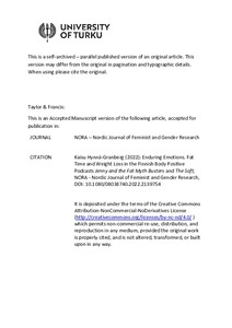 The article analyses two Finnish body positive podcasts, Jenny and the Fat Myth Busters and The Soft, zooming in on their way of discussing weight loss. Drawing on queer studies’ understanding of queer time, the article discusses fat time as a nonlinear temporality, which, as a product of fat-marginalizing culture, is hurtful yet characterized by a potential to resist. The article utilizes Sara Ahmed, Rebecca Coleman, and Sienne Ngai’s formulations of emotions and temporality. It utilizes the method of a situated close reading where the author’s experience with weight loss works as an important resource for analysis. The article argues that fat time is characterized by “ugly feelings that stay.” The endurance of feelings expands existing understandings of fatness by arguing that fat could be discussed as an affective presence beside it being viewed as a material reality. Even as the body changes, emotions such as anxiety and pessimism endure, making both the present and future fat.