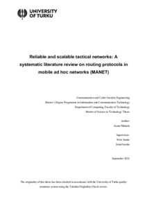 (28.09.2025)Tactical environments are challenging for wireless communication. The area of operation lacks infrastructure while the operations require reliable communications and scalable networks. Mobile ad hoc networks (MANET) is a ...avoin -