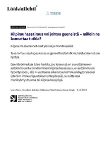 <p>• Kilpirauhassairaudet ovat yleisiä ja monitekijäisiä. <br></p><p>• Tavanomaisissa tapauksissa ei geneettisistä tutkimuksista yleensä ole hyötyä. <br></p><p>• Geenitutkimuksia tulee harkita, jos kyseessä on suvuittainen ... -