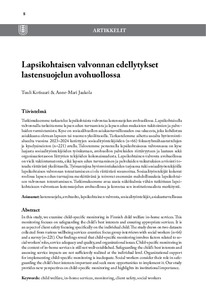 <p>Tutkimuksemme tarkastelee lapsikohtaista valvontaa lastensuojelun avohuollossa. Lapsikohtaisella valvonnalla tarkoitetaan lapsen edun turvaamista ja lapsen edun mukaisten tukitoimien ja palveluiden varmistamista. Kyse ... -