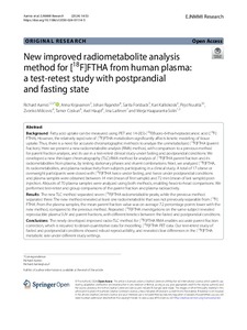 New improved radiometabolite analysis method for [18F]FTHA from human plasma : a test-retest study with postprandial and fasting state