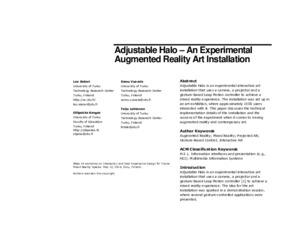 <p> Adjustable Halo is an experimental interactive art installation that uses a camera, a projector and a gesture-based Leap Motion controller to achieve a mixed reality experience. The installation was set up in an art ... -
