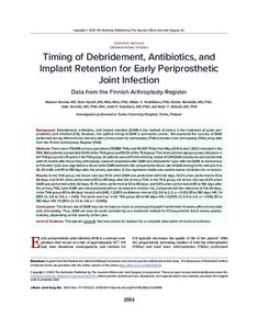 <h3>Background: </h3><p>Debridement, antibiotics, and implant retention (DAIR) is the method of choice in the treatment of acute periprosthetic joint infection (PJI). However, the optimal timing of DAIR is somewhat unclear. ... -