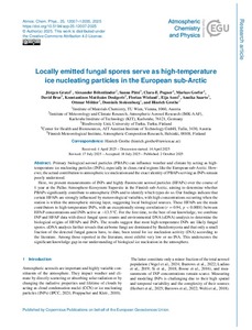 <p>Primary biological aerosol particles (PBAPs) can influence weather and climate by acting as high-temperature ice nucleating particles (INPs), especially in clean, rural regions like the European sub-Arctic. However, the ... -
