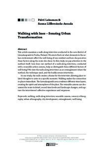 <p>This article examines a walk-along interview conducted in the new district of Linnakaupunki in Turku, Finland. We aim to find out what elements in the urban environment affect the well-being of one resident and how she ... -