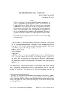 <p>This article discusses knowledge gained through experiencing the presence of God through the ‘spiritual senses’ as a resource in an Evangelical Lutheran parish. Believers’ being-in-touch experiences with the divine ... -