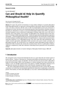 <p>We explore the potential and limitations of using artificial intelligence to quantify philosophical health. Philosophical health is an approach to well-being defined as the dynamic coherence between thoughts, values, ...