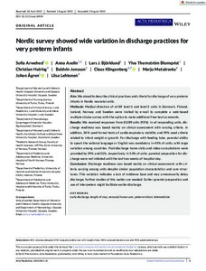 <p><strong>Aim </strong><br></p><p>We aimed to describe clinical practices and criteria for discharge of very preterm infants in Nordic neonatal units.<br></p><p><strong>Methods </strong><br></p><p>Medical directors of all ... -