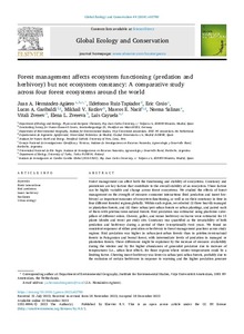 Forest management affects ecosystem functioning (predation and herbivory) but not ecosystem constancy: A comparative study across four forest ecosystems around the world