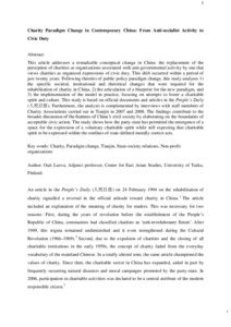 This article addresses a remarkable conceptual change in China: the replacement of the perception of charities as organizations associated with anti-governmental activity by one that views charities as organized expressions ... -