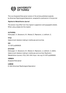 <p> Objective: This article explores the ideological dilemmas of decision making identified in members’ and staff’s talk in Clubhouse communities. Method: The data are drawn from a corpus of 10 video-recorded focus group ... -