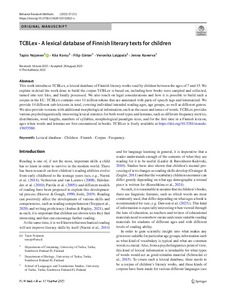 <p>This work introduces TCBLex, a lexical database of Finnish literary works read by children between the ages of 7 and 15. We explain in detail the work done to build the corpus TCBLex is based on, including how books ... -