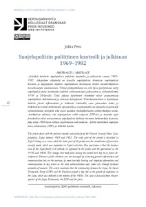 <p>Artikkeli käsittelee suojelupoliisin poliittista kontrollia ja julkisuutta vuosina 1969–1982. Aikajakson alkupäätä on kuvailtu suojelupoliisin historiassa suojelupoliisin kriisiksi ja loppupäässä tapahtui suojelupoliisin ... -