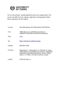 <h2>ABSTRAKTI</h2><p>Tässä artikkelissa tarkastellaan arkipäivän utopioita ja niiden materiaalisia järjestyksiä. Arkipäivän utopioilla viitataan yhteisöihin, joissa eletään todeksi vaihtoehtoisia ja kestävämpiä elämänmuotoja. ... -