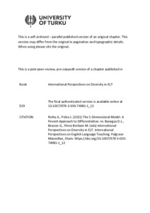 This chapter focuses on differentiation in English language teaching. We present the 5-dimensional (5D) model of differentiation which has been created based on the Finnish educational context. The model is grounded in the postulate that differentiation is a proactive and student-centred approach that permeates all teaching and involves the entire school community. The 5D model progresses from general to specific. It advocates for differentiation to be implemented holistically in several dimensions of teaching which are teaching arrangements, learning environment, teaching methods, support materials and assessment. Furthermore, it proposes that all differentiation should be based on students’ individual characteristics, such as learning profile, self-esteem, interests, readiness, needs, motivation, personality and history.