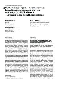 Integratiivisen kirjallisuuskatsauksen tarkoituksena oli kuvata lasten mielenterveys- ja käytösongelmien ennaltaehkäisyyn ja hoitoon tarkoitettujen vanhemmuusohjelmien käytettävyyttä haavoittuvassa asemassa olevien vanhempien näkökulmasta. Tavoitteena oli tuottaa kuvaus vanhemmuusohjelmista sekä lisätä tietoa niiden saavutettavuutta edistävistä ja estävistä tekijöistä. Systemaattinen haku tehtiin PubMed/Medline, CINAHL, PsychINFO, Cochrane Library ja ERIC-tietokantoihin. Tiedonhaku rajattiin koskemaan interventiotutkimuksia. Aineisto analysoitiin deduktiivisesti käytettävyyttä kuvaavien osa-alueiden (hyväksyttävyys, tarve, implementointi, käytännöllisyys, adaptiivisuus, integrointi, siirrettävyys, vaikuttavuuden testaus) mukaisesti sekä laatimalla kuvaus vanhemmuusohjelmista TIDieR-tarkistuslistan mukaisesti. Katsaukseen valittiin mukaan 13 tutkimusta, jotka käsittelivät viittä eri vanhemmuusohjelmaa. Osallistumista edisti muun muassa käytännön järjestelyissä tukeminen, vanhemmuusohjelman maksuttomuus sekä palvelun sopivuus perheen tarpeisiin. Osallistumista puolestaan esti esimerkiksi muutokset perheen taloudellisessa tilanteessa sekä aikatauluongelmat. Kaikilla vanhemmuusohjelmilla oli lyhytaikaista vaikutusta lasten käytöshäiriöoireisiin. Ohjelmien käytön havaittiin vahvistavan vanhemmuustaitoja ja vähentävän vanhempien kuormitusta. Johtopäätöksenä voidaan todeta, että haavoittuvassa asemassa olevien vanhempien vanhemmuusohjelmien käytettävyyttä lisää oikea-aikaisesti tarjottu palvelu, palvelun osuvuus lapsen ja perheiden tarpeisiin, osallistumisen tukeminen sekä palvelun joustavuus.