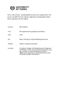 Fats are important during pregnancy and infancy not only as energy sources but also as structural components of cellular membranes and precursors of bioactive signaling compounds. Fats and particularly long-chain polyunsaturated fatty acids (LC-PUFA) are crucial for fetal and infant tissue development and organogenesis, and may also play a role in the future health of the infant, i.e. in the child's neurodevelopment and his/her risk of developing a range of diseases such as allergic diseases. The mother–placenta–fetus interaction and the related adaptive and regulatory mechanisms ensure optimal fetal growth and development. These processes may be influenced by maternal dietary intakes and body composition during pregnancy and breastfeeding, and again by the dietary intake of the infant. Reference values have been set for dietary intake of fats for each of these periods, i.e. pregnancy, breastfeeding, and infancy.