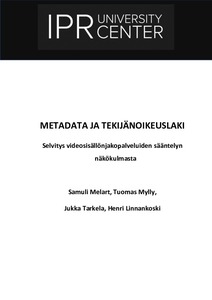 Tässä IPR University Centerin tuottamassa ja opetus- ja kulttuuriministeriön rahoittamassa selvityksessä tarkastellaan tekijänoikeudellista metadataa koskevaa sääntelyä ja käytäntöjä EU:n tekijänoikeuksia koskevan DSM-direktiivin 17 artiklan määritelmän mukaisten suurten verkkosisällönjakopalvelun tarjoajien sisällönhallinnan kontekstissa. Selvitys painottuu metadatan tarkastelussa erityisesti videosisällönjakopalveluihin, jotka säilyttävät merkittävissä määrin tekijänoikeudella suojattua sisältöä ja joiden sisältö perustuu lähes kokonaan palvelun käyttäjien tekemiin latauksiin. Erityisesti suuret videosisällönjakopalvelut käyttävät metadataa osana kehittyneitä sisällönhallintajärjestelmiänsä sisällön kuvailuun ja hallinnointiin, mukaan lukien tekijänoikeudellinen oikeuksien hallinnointi.