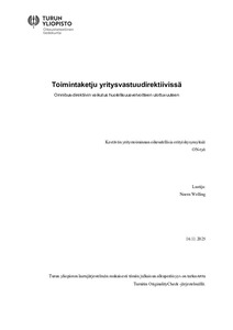 (19.11.2025)Tässä ON-työssä tarkastellaan, miten toimintaketju-käsitteen käyttö yritysvastuudirektiivissä ja sen mahdollinen kaventuminen lainsäädäntöprosessissa olevan omnibus-direktiivin myötä vaikuttavat yritysten huolellisuusvelvoitteen ...avoin -