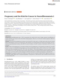 Neurofibromatosis type 1 (NF1) is associated with a high risk for cancer. Benign cutaneous neurofibromas of women with NF1 may increase in size and number during pregnancy. However, it is not known whether pregnancy affects the risk for cancer in NF1.