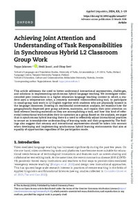This article addresses the need to better understand interactional asymmetries, challenges, and solutions in implementing synchronous hybrid language teaching. We investigate video-recorded peer interactions in a higher education language teaching context in which a student uses a telepresence robot, a remotely moveable videoconferencing tool, to participate in small-group task work in L2 English together with students who are physically located in the language classroom. Drawing on multimodal conversation analysis, we examine how the geographically dispersed peer group achieves, maintains, and repairs their joint attention on task-relevant learning materials as they are accomplishing a task, and how this kind of referential interactional work enables their co-operation as a group. Based on the analysis, we argue that in synchronous hybrid learning there is a need to reflexively adjust interactional practices to secure an intersubjective understanding of learning tasks and their progressivity. The findings also suggest that sensory and interactional asymmetries should be taken into account when developing and implementing synchronous hybrid learning environments that aim at equality of opportunities regardless of the participation mode.