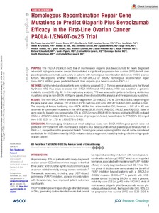 Purpose: The PAOLA-1/ENGOT-ov25 trial of maintenance olaparib plus bevacizumab for newly diagnosed advanced high-grade ovarian cancer demonstrated a significant progression-free survival (PFS) benefit over placebo plus bevacizumab, particularly in patients with homologous recombination deficiency (HRD)-positive tumors. We explored whether mutations in non-BRCA1 or BRCA2 homologous recombination repair (non-BRCA HRRm) genes predicted benefit from olaparib plus bevacizumab in PAOLA-1.