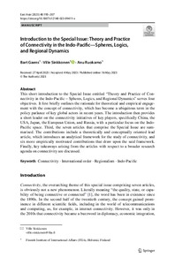 This short introduction to the Special Issue entitled “Theory and Practice of Connectivity in the Indo-Pacific – Spheres, Logics, and Regional Dynamics” serves four objectives. It first briefly outlines the rationale for theoretical and empirical engagement with the concept of connectivity, which has become a ubiquitous term in the policy parlance of key global actors in recent years. The introduction then provides a short leader on the connectivity initiatives of key players, specifically China, the USA, Japan, the European Union, and Russia, with a particular focus on the Indo-Pacific space. Third, the seven articles that comprise the Special Issue are summarised. The contributions include a theoretically and conceptually oriented lead article, which introduces an analytical framework for the study of connectivity, and six more empirically motivated contributions that draw upon the said framework. Finally, key takeaways arising from the articles with respect to a broader research agenda on connectivity are discussed.