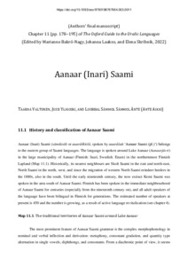 Aanaar (Inari) Saami is an indigenous language spoken around Lake Aanaar in the municipality of Aanaar (Finnish: Inari) in the northernmost Finland. Aanaar Saami is the only Saami language traditionally spoken only within the territory of Finland. One of the most successful examples of language revitalization globally, Aanaar Saami has currently approximately 450 speakers. While the grammatical structure of the language shares many typical features with the eastern Saami languages, from the perspective of the lexicon it is closer to North Saami in the west than to Skolt Saami in the east. The most prominent feature of Aanaar Saami grammar is the complex morphophonology in nominal and verbal inflection and derivation: metaphony, consonant gradation, and quantity-type alteration in single vowels, diphthongs, and consonants. As virtually all speakers of Aanaar Saami are bilingual in Finnish, this majority language increasingly affects especially the syntax and lexicon of Aanaar Saam