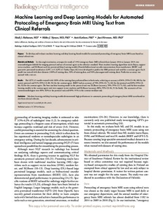Conclusion Machine learning and deep learning models demonstrated high performance in automatic protocoling emergency brain MRI scans based on text from clinical referrals. Published under a CC BY 4.0 license.