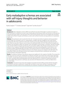 The present study shows that significant associations between EMSs and both self-harm thoughts and behavior exist also in adolescents. Stronger EMSs are linked to more severe self-harm. Knowledge of these associations may help to improve the understanding and treatment of adolescents suffering from self-harm.