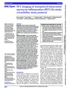 Methods and analysis: This PET imaging feasibility study will enrol patients scheduled for surgical treatment of UIA. The study subjects will undergo PET imaging of the intracranial arteries within 1 month before planned surgery. The imaging protocol includes 18F-FDG PET MRI, MRA with gadolinium enhancement, and 68Ga-DOTANOC PET CT. The study will also involve preoperative blood samples, intraoperative cerebrospinal fluid (CSF) samples, and aneurysm sac biopsy. Planned sample size is at least 18 patients. Primary outcome is uptake of 18F-FDG or 68Ga-DOTANOC in intracranial arterial aneurysms compared with contralateral normal vessel as maximum standardised uptake value or target-to-blood pool ratio and correlation of uptake of 18F-FDG or 68Ga-DOTANOC to aneurysm histological findings. Secondary outcomes include estimating the correlations between uptake of 18F-FDG or 68Ga-DOTANOC and histological findings with blood and CSF miRNA-levels, arterial wall enhancement in gadolinium enhanced MRA, aneurysm size and shape, smoking, hypertension, and location of the aneurysm.