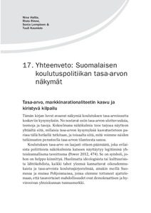 Viime vuosina suomalaisenkin koulutuspolitiikan kentässä on kuitenkin yhä vahvemmin siirrytty kohden uusliberalistista koulutuspolitiikkaa, jossa vanhat tasa-arvon pyrkimykset ovat saaneet antaa periksi koulutuksen tehostamispaineille. Koulutuksen globaalissa valtavirrassa myös paineet esimerkiksi koulutuksen yksityistämiseen ovat nostaneet päätään Suomessakin. Julkinen valta on siirtynyt loitommalle koulutuksen pääohjaajan paikalta ja antanut tilaa koulutusmarkkinoiden vapaammalle toiminnalle. Tämän kirjan luvut avaavat näkymiä koulutuksen tasa-arvoisuutta koskeviin kysymyksiin Suomessa ja vähän laajemminkin maailmalla. Kirjassa käsitellään koulutuksen tasa-arvon tilaa yleisesti koulutuspolitiikassa, peruskoulussa ja korkeakoulutuksessa, maahanmuuttajien asemaa kirjavoituvassa koulussa sekä nuorten aikuisten koulutus- ja elämäntarinoita. Pyrkimyksenä on nostaa esiin uusia ja raikkaita ajatuksia siitä, miten tämän päivän Suomessa menee ja miten voisi mennä.