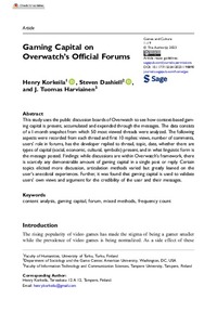 This study uses the public discussion boards of Overwatch to see how context-based gaming capital is present, accumulated and expended through the messages. The data consists of a 1-month snapshot from which 50 most viewed threads were analyzed. The following aspects were recorded from each thread and first 10 replies: views, number of comments, users' role in forums, has the developer replied to thread, topic, date, whether there are types of capital (social, economic, cultural, symbolic) present, and in what linguistic form is the message posted. Findings: while discussions are within Overwatch's framework, there is scarcely any demonstrable amount of gaming capital in a single post or reply. Certain topics elicited more discussion, articulation methods varied but greatly leaned on the user's anecdotal experiences. Further, it was found that gaming capital is used to validate users' own views and argument for the credibility of the user and their messages.