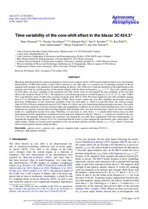 Measuring and inferring the key physical parameters of jets in active galactic nuclei (AGN) requires high-resolution very long baseline interferometry (VLBI) observations. Using VLBI to measure a core-shift effect is a common way of obtaining estimates of the jet magnetic field strength, a key parameter for understanding jet physics. The VLBI core is typically identified as the bright feature at the upstream end of the jet, and the position of this feature changes with the observed frequency, rcore ∝ ν−1/kr. Due to the variable nature of AGN, flares can cause variability of the measured core shift. In this work, we investigated the time variability of the core-shift effect in the luminous blazar 3C 454.3. We employed a self-referencing analysis of multi-frequency (5, 8, 15, 22−24, and 43 GHz) Very Long Baseline Array (VLBA) data covering 19 epochs from 2005 to 2010. We found significant core-shift variability ranging from 0.27 to 0.86 milliarcsec between 5 GHz and 43 GHz. These results confirm the core-shift variability phenomenon observed previously. Furthermore, we also found time variability of the core-shift index, kr, which was typically below one, with an average value of 0.85 ± 0.08 and a standard deviation of 0.30. Values of kr below one were found during flaring and quiescent states. Our results indicate that the commonly assumed conical jet shape and equipartition conditions do not always hold simultaneously. Even so, these conditions are typically assumed when deriving magnetic field strengths from core-shift measurements, which can lead to unreliable results if kr significantly deviates from unity. Therefore, it is necessary to verify that kr = 1 actually holds before using core-shift measurements and the equipartition assumption to derive physical conditions in the jets. When kr = 1 epochs are selected in the case of 3C 454.3, the magnetic field estimates are consistent, even though the core shift varies significantly with time. Subsequently, we estimated the magnetic flux in the jet of 3C 454.3 and found that the source is in the magnetically arrested disc state, which agrees with earlier studies. Finally, we found a good correlation of the core position with the core flux density, rcore ∝ Score0.7, which is consistent with increased particle density during the flares.