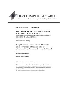 Objective: We describe period trends in the proportion of individuals in union and the flow of union formation and dissolution at ages 18–49 across educational levels for men and women in 1989–2019 in Finland.