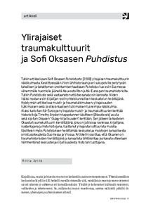 Aluksi kartoitan Itä-Euroopan ylirajaista muisti- ja traumakulttuurien kenttää historioitsija Timothy Snyderin tappotanner-käsitteen (Bloodlands) avulla sekä sijoitan Oksasen ”gulag-kirjallisuuden” kenttään. Sen jälkeen tarkastelen Oksasta traumakulttuurin kierrättäjänä, joka on julkisissa rooleissa, kirjailijana, kustantajana ja historioitsijana, tuottanut ylirajaista kulttuurista muistia. Käsittelen myös Puhdistuksen herättämää keskustelua muistojen kansallisesta omistusoikeudesta Suomessa ja Virossa. Artikkelini osoittaa, että Oksanen on traumahistorioiden kierrättäjänä ja kansallista lähtökohtaa purkavalla otteellaan hämmentänyt keskustelua kirjallisuudesta historian tuottajana.