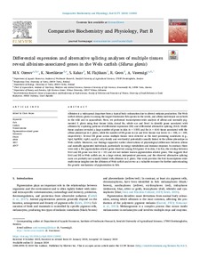 Albinism is a widespread departure from a typical body colouration due to altered melanin production. The Wels catfish (Silurus glanis) is among the largest freshwater fish species in the world, and albino individuals occur both in the wild and in aquaculture. Here, we performed transcriptome-wide analysis of albino and normally pigmented S. glanis using four tissues (skin, dorsal fin, whole eye and liver) to identify genes associated with albinism by exploring patterns of differential expression (DE) and differential alternative splicing (DAS). Multi-tissue analyses revealed a large number of genes in skin (n = 1355) and fin (n = 614) tissue associated with the albino phenotype in S. glanis, while the number of DE genes in eye and liver tissues was lower (n = 188, n = 189, respectively). Several DE genes across multiple tissues were detected as the most promising candidates (e.g., hsp4, hsp90b1, raph1, uqcrfs1, adcy-family and wnt-family) potentially causally linked to the albino phenotype in Wels catfish. Moreover, our findings supported earlier observations of physiological differences between albino and normally pigmented individuals, particularly in energy metabolism and immune response. In contrast, there were only a few pigmentation-related genes observed among DAS genes (4 in skin, 2 in fin), the overlap between DAS and DE genes was low (n = 25) and did not include known pigmentation-related genes. This suggests that DAS and DE in Wels catfish are, to a large extent, independent processes, and the observed alternative splicing cases are probably not causally linked with albinism in S. glanis. This work provides the first transcriptome-wide multi-tissue insights into the albinism of Wels catfish and serves as a valuable resource for further understanding the genetic mechanisms of pigmentation in fish. © 2023