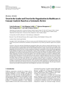 Orientation. Trust is the central part of leadership and organizational culture and can often go unnoticed until it decreases. There is a lack of a comprehensive concept analysis of trust in the healthcare setting. Research Purpose. The research aim was to gather, assess, and synthesize previous empirical evidence from the field of healthcare about the concepts of trust in the leader and trust in the organization. Motivation for the Study. To create a comprehensive and generic concept analysis of trust in the leader and organization for the healthcare sector based on recent empirical studies. Research Design and Method. A concept analysis, which followed the method presented by Walker and Avant, was conducted as a systematic review that adhered to the PRISMA guidelines. A total of eight databases were searched for relevant literature and 42 articles were included. Main Findings. The definitions of trust in the leader and the organization were based on emotion and cognition. Trust in the leader emerged as a core feature of collaborative leader-employee relationships, whereas trust in the organization was a key construct of organizational functioning. Trust in the leader and the organization contributed to commitment, increased work production, enhanced collaboration, and improved workplace well-being. Defense mechanisms were identified as a new contrary concept, while justice was found to be a related concept. Contribution. Both trust in the leader and trust in the organization positively impact an organization, nurse leaders, and employees. Deeper knowledge of trust and its attributes will be critical to the operationalization and estimation of levels of trust in healthcare organizations. Managerial Implications. Trust in the leader and the organization can significantly influence the attractiveness of an organization, retention of personnel, productivity, and work-related well-being. Thus, this aspect should be measured and developed systematically while acknowledging the antecedents of trust building.