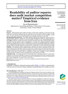 Originality/value – This paper expands the existing literature by examining the impact of audit market competition on audit report readability. It focuses on a unique audit market (Iran), where competition among audit firms is more intense than in developed countries due to the liberalization of the Iranian audit market in 2001 and the establishment of numerous private audit firms.