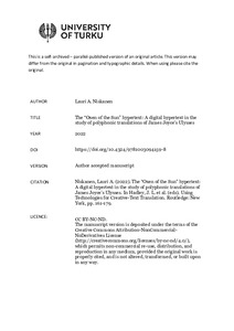 This chapter explores the Oxen of the Sun hypertext (OSH), a digital hypertext created for the analysis of the Finnish and Swedish translations of stylistic imitation, or pastiche, in the “Oxen of the Sun” episode of James Joyce’s Ulysses (1922). The device was created for a doctoral dissertation, A Hubbub of Phenomenon: The Finnish and Swedish Polyphonic Translations of James Joyce’s “Ulysses” (2021), which focused on three episodes of Ulysses and its (re)translations. In the chosen episodes, the intertextuality and intermediality of the text is made explicit through the literary techniques of pastiche, parody, and the musicalisation of fiction. The hypertext and its signal-based method work as analytic aids for the study of how the hypertext of the “Oxen of the Sun” episode refers to its hypotexts from the history of English prose, and how these imitations are re-created in the four Finnish and Swedish translations. In addition to the hypotexts imitated, the “embryonic development” of English prose style, the site offers passages of the Finnish and Swedish target texts and back-translations into English. As imitation is not quotation, analysis of pastiche cannot be based on lexical units. Instead, the OSH method is based on Margaret A. Rose’s “signals of parody”, a method of identifying different “tags”, including syntactic and lexical traits, that operate as triggers for intertextual reading. These can then be compared to the target texts and their respective hypotexts in the target language(s). This chapter discusses the research questions that can be addressed with the hypertext and the methodology the OSH can offer, and it tests the hypertext with two example analyses from the “Oxen” episode, illustrating which types of textual relations can be detected by the digital OSH method.
