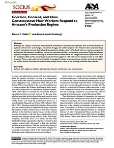 Although the “logistics revolution” has powerfully transformed contemporary capitalism, little is known about how logistics workers view such changes. To address this gap, the authors explore how Amazon’s labor practices shape workers’ orientations toward their jobs and class positions. Using a mixture of in-depth interviews and survey data, the authors find that Amazon’s production regime has contradictory effects on workers’ orientations. Digital surveillance augments managerial coercion, fostering an alienated relation toward work and a heightened sense of exploitation. Yet the company’s ability to hire precariously situated workers supplies it with workers who clearly consent to such labor practices. These results underscore the duality of managerial regimes among warehouse workers and begin to explain the ordeal of union formation, as workers adopt sharply distinct views of the working conditions they confront.