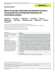 The nuts of Torreya grandis are abundant in flavonoids, providing potential antioxidant activity. Considering that T. grandis can yield nuts for hundreds or thousands of years, effects of tree age on flavonoids and antioxidant activity of T. grandis nuts were targeted in this study for the first time. Results revealed that antioxidant activity and total flavonoid contents in 100- and 1000-years-old T. grandis nuts were much higher compared to 10-years-old T. grandis. The content of 19 flavonoids showed significant correlations with antioxidant activity in 100- and 1000-years-old trees using metabolites profiling. Transcriptome and coexpression analysis indicated that seven genes were associated with aged-related flavonoids biosynthesis. Further analysis showed that abscisic acid and gibberellin might regulate the age-related differential flavonoids accumulation. Our study provides a novel viewpoint that aged T. grandis is likely to present a better source of natural antioxidants and has yet to be examined in other tree models.