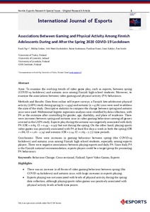 Conclusions: There were increases in gaming behaviour between spring (COVID-19 lockdown) and autumn 2020 among Finnish high school students, especially among Esport players. There were negative associations with esport playing and daily PA. Since daily PA is the Finnish national recommendation, esport players could be a target group to promote PA behaviours.