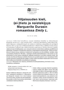 Tutkin tässä teoreettisessa esseessä ranskalaisen kirjailijan ja elokuvaohjaajan Marguerite Durasin (1914–1996) romaania Emily L. (1989/1987) siitä kulmasta, kuinka taiteen teke-minen, hiljaisuus ja sukupuoli kiertyvät siinä toisiinsa ja minkälaisia sukupuolittuneita merkityksiä hiljaisuus siinä saa. Kyseessä on iäkkään kirjailijanaisen elämänsä illassa sepittämä, itseään peilaava tai moninaistava ”antitarina”, joka sisältää kertomuksen myös toisesta, elämänsä viimeiselle matkalle valmistautuvasta kirjailijanaisesta. Luen romaania keskeisen modernistisen uudistajan autofiktiivisenä tutkielmana länsimaisen kirjallisuuden historiasta poispyyhitystä naistekijyydestä. Tällaisessa kehys-tyksessä teoksesta kasvaa vaikuttava, feministisesti kantaaottava poeettis-poliittinen metafora. Käyn vuoropuhelua feministisen filosofian, ranskalaisen kirjallisuudentutkimuksen sekä mustan ja post-koloniaalisen teorian kanssa osoittaakseni radikaalin moninaisen teoreettisen ajattelun avulla, että Durasin esteettisessä ilmaisussa tyylitelty hiljaisuus luo paradoksaalisesti aivan omanlaistaan kieltä. Lopuksi tarkastelen transkielisyyden käsitteen avulla, kuinka durasilainen hiljaisuuden kieli nivoutuu hänen kulttuurisesti hybridiin ja monikieliseen taustaansa.