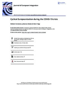Utilising expert interviews, the article examines how different but overlapping logics of action guided the policies of the EU and its member states in the first year and a half of the Covid pandemic. We see three distinct logics – selfishness, emulation and coordination – taking shape, which together form a framework of cyclical Europeanisation. Efforts to cope with the pandemic made tensions between the Commission and its self-interested member states apparent. However, the member states were simultaneously able to learn from each other and thus emulate policy practices under conditions of uncertainty. Hence, regardless of the problems incurred, the ability to revert the tensions between the different logics of action and combine them pragmatically has reinforced some sense of Europeanisation within the European polity. External shocks intensify the cycles through which Europeanisation evolves and materialises, and bring to light the EU’s ability to act and react, improvise and adapt.