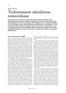 Tiedostamattoman ”löytäminen” yhdistetään Sigmund Freudin 1900-luvun alussa kehittämään psykoanalyysiin. Aikalaisensa Eduard von Hartmannin ohella Freud viittaa Unien tulkinnassaan (Die Traumdeutung, 1899) 1800-luvun alun romantiikan filosofeihin F. W. J. Schellingiin, Arthur Schopenhaueriin ja Gotthilf Heinrich von Schubertiin1. Tästä ei kuitenkaan tule päätellä, että romantikot olisivat ”ennakoineet” psykoanalyysia, vaan Freud pikemminkin otti heiltä vaikutteita. Minän tiedostamaton toiminta oli tunnettua jo saksalaisille idealisteille, ja mielen ”pimeä puoli” oli yleinen aihe saksalaisen romantiikan kirjallisuudessa.