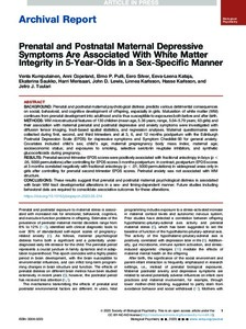 Prenatal and postnatal maternal psychological distress predicts various detrimental consequences on social, behavioral, and cognitive development of offspring, especially in girls. Maturation of white matter (WM) continues from prenatal development into adulthood and is thus susceptible to exposures both before and after birth.