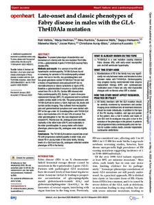 Methods and results: In a woman in her 60s with hypertrophic cardiomyopathy, T410A/GLA was found in screening for variants in 59 cardiomyopathy-related genes. Her son in his 40s, two granddaughters and two great grandsons carried T410A/GLA. The son had a history of hypertension and paroxysmal AF but no microalbuminuria or classic symptoms or signs of FD. Baseline α-galactosidase A enzyme (α-Gal A) activity varied from 0% to 26.5%. Cardiac MRI showed mild Fabry cardiomyopathy (FC). During 11 years of enzyme replacement therapy (ERT), FC progressed and he suffered sudden cardiac death in his 50s. The great grandsons with T410A/GLA had no active α-Gal A, high lyso-Gb3 levels and normal cardiac imaging. They suffered from neuropathic pain and gastrointestinal symptoms and were started with ERT at the age under 10. Granddaughters with T410A/GLA had α-Gal A activities of 8-18 and 10% of normal. The older granddaughter in her 30s was diagnosed with incipient FC. Plasma lyso-Gb3 analogues were elevated, markedly in the elder male with FC and moderately in the elder granddaughter. In young males with classic phenotype, plasma lyso-Gb3 analogues were only slightly elevated.