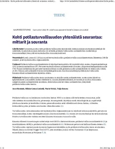 Päätelmät Potilasturvallisuuden tason seurantaan on tarjolla useita indikaattoreita, mutta niiden käyttö on epäyhtenäistä. Lukumäärän lisäksi oleellista on, kuinka järjestelmällisesti, avoimesti ja muuhun toimintaan integroituneesti indikaattoreita seurataan. Jatkotutkimusta tarvitaan indikaattorien yhteydestä