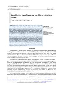 This study examines play in the Finnish home context by specifically concentrating on the forms of play, quality factors of play and social nature of play. It is of particular interest to study play especially of three-year-olds, because the research on play for this group, in home environment is scarce especially in the Finnish context. This study is part of longitudinal, multidisciplinary study (STEPS) and is based on the responses from 921 families who answered the questionnaires both at the study recruitment point and at three years. The data were gathered during the years 2011–2013 for the first time ever from the Finnish home context and are a basis for research to be done later. There is a need for this kind of descriptive and identifying study to understand play in the home context. The results suggest that play, and especially playing outdoors, had a strong position in children’s lives. Some forms of play were clearly gender-based and some demographic factors had a connection to the social nature of play. In addition, the level of participation in early childhood education and care was associated with play. No earlier studies have been conducted on the associations between participating in ECE and an increase in the sociability of play in the home context. Participating in ECE expands children´s social network and promotes possibilities to form friendships. In public discourse, the need to increase children's participation in ECEC has been strongly emphasized. This research supports these views.